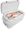 White beach marine camping boat fishing cooler wheeled igloo 120 quart ice chestfeatures:polyethyleneunique horizontal slide-and-lock telescoping handle provides maximum leverage and lightens lifting loadsultratherm insulated body and lid keep ice for 5 days at 90 degrees fahrenheitvirtually indestructible zinc-plated metal hingesoversized sport rally wheelsattractive, yet rugged styling40 x 19 x 20.3 inches this rolling cooler keeps the transportation easy. Slide-and-lock handle is ideal for pulling and also makes for easy storing, and the oversized rally wheels can roll in any terrain. Extreme cooling is accomplished with ultratherm insulated body and cool riser technology, which can keep ice for up to five days when it's 90 degrees fahrenheit outside.
