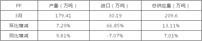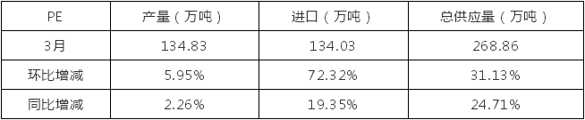 In March, the output and imports of PE all increased. The total supply has climbed to the historical peak. The port inventory is also at the same period of the previous year. The pressure on domestic PE stocks is relatively high, and the abundant supply of goods on the market will restrain the rebound of the market. And continuity.